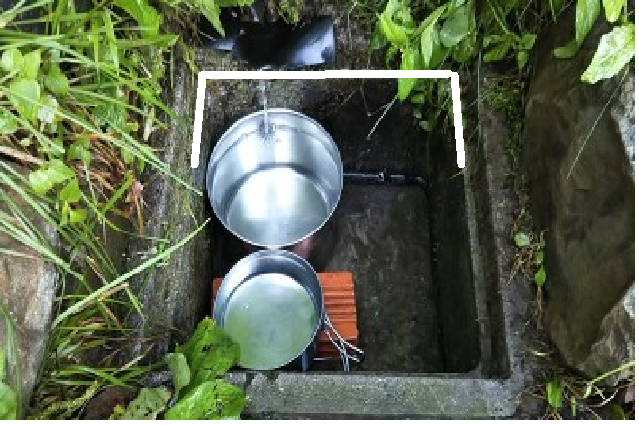水は岩盤の途中から流れ出て、2mほどの緩斜面を伝わってコンクリート桝に到達します。