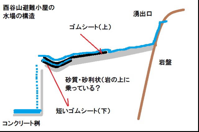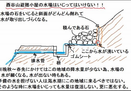 さきごろ、掲示板「酉谷山避難小屋ノート」に、Nさんから水場についての投稿があったので、この際、心ある皆様に水場の構造を知っていただきたく、このページで取りまとめたいと思います。この水場の構造を知ると、2度とほしいがままに触ってはいけないということがよくお分かりいただけることと思います。