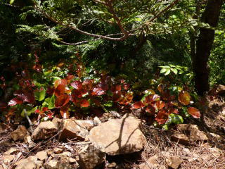 坪山のイワカガミが咲く場所の標高は1,000m前後と見られるが,滝子山と比較するとその標高は350m〜500m低い。土曜日なのに登山者もおらず,これはまずいかなと思っていたところ,案の定イワカガミは花柄だけを残し新しい葉が出てしまっていて,花は一つもなかった。時期的に10日の差と低い標高からすると,坪山のイワカガミの盛期は滝子山よりずうっと早いようである。