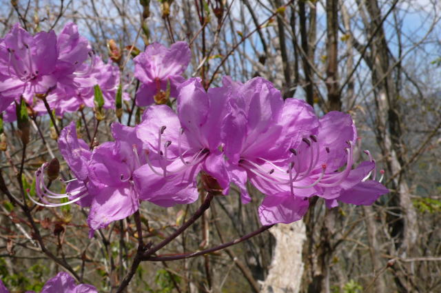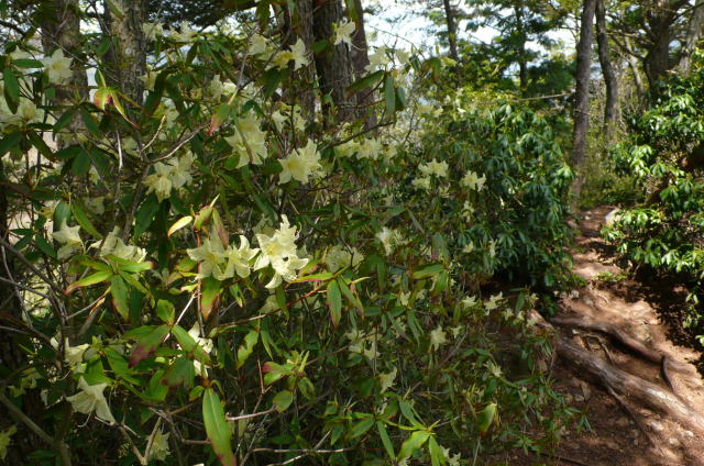 ヒカゲツツジとイワウチワの時期の、多くの登山者によって登山道はきっちり踏み締められている。当然、イワウチワもヒカゲツツジもイワウチワもその犠牲にはなっているが、これだけ喧伝されると致し方ないのかもしれない。頂上手前にミツバツツジが残っている。もうすぐそこの頂上からは、先客の声が聞こえてくる。