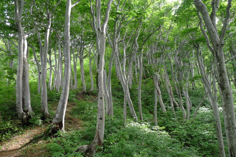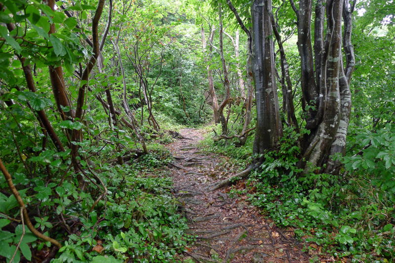 親不知から白鳥小屋までの山地図でのコースタイムは6時間40分です。その白鳥小屋を過ぎ、下駒ヶ岳、菊石山を越えてようやく黄連山に取り付くようになると、いったんブナ林の中のフットパスを歩くようになります。降り続く雨も上がって、陽が射しこみます。なかなか腰が上がりません。このペースで残る3時間半、栂海山荘まで頑張るしかありませんが、結局はトータルで12時間を要し山荘に到着です。