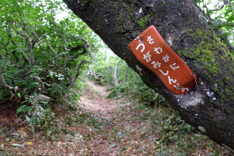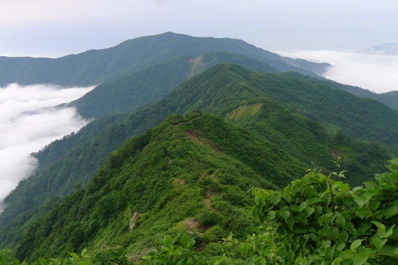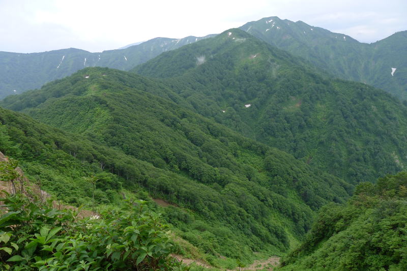 ホテルで作ってもらったおにぎりのお弁当をザックに入れて、午前5時50分、雨の中を登山道に取り付きます。鬱蒼とした植林地の急登を我慢しながら坂田峠まで歩き、一息入れます。すると青年が登ってきて同じコースを歩くことが分かりました。先に進む青年の足取りは余りにも早いのですが、こちらは年齢相応の鈍足で進みます。(青年は、私より2時間遅く出発し、2時間早く栂海山荘に到着しています。)