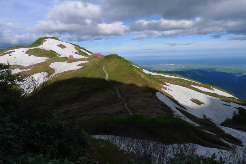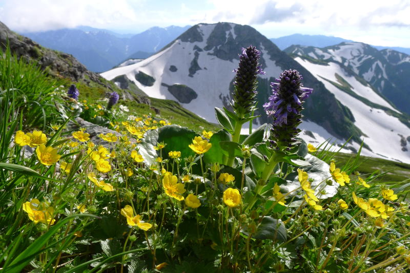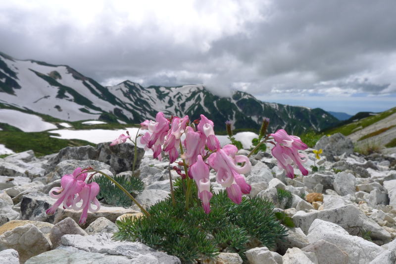 雪倉岳の頂上までは長い道のりです。簡単に登れそうなのにそうはさせてくれない大きな斜面を持っています。頂上からは植生がガラッと変わってハイマツと草付が交互になり、ハイマツの中にもその周縁にも、もちろん草付の中にもさまざまな花が咲いています。中でもウルップソウ、ツクモグサは圧巻で、いつもの場所にはミヤマハンショウヅルとクロユリが待っていてくれました。