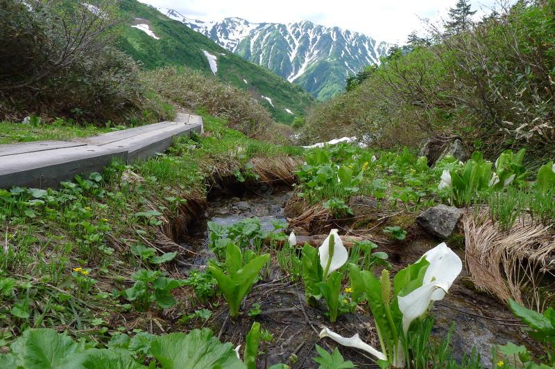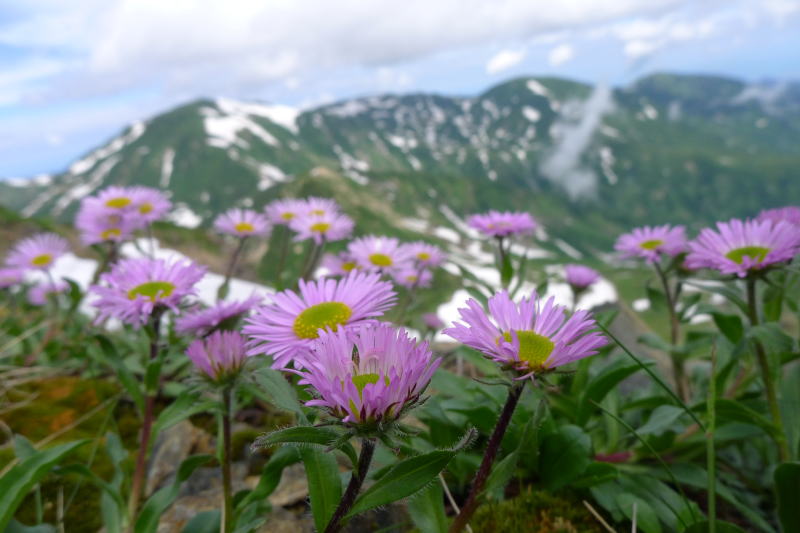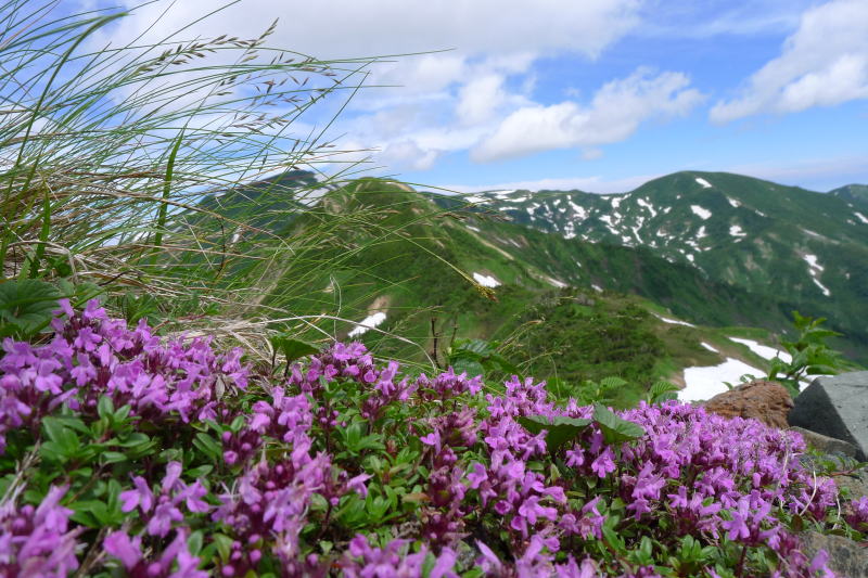 ツバメ平の先の水場で一息入れ、ガレ場に向かいます。これから雪倉岳の花の斜面が待ち受けています。何と言ってもミヤマアズマギク、イブキジャコウソウ、ミヤマムラサキ、ウルップソウですが、雪田斜面にはシナノキンバイ、ハクサンイチゲ、シラネアオイなどが群生しています。