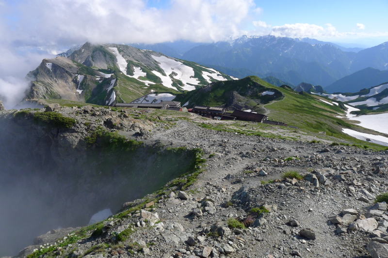 朝日小屋のテント場は、もう4時から撤収が始まっています。いつものように最後の方の人となってテン場を後にします。朝一番の朝日岳の登り返し、頂上からの歩きづらい木道と雪渓の道。ライチョウの雛が見ることができラッキーと思ったとたん、濡れた木道に足をすくわれ転倒します。怪我がなくてよかった・・・。
