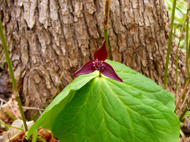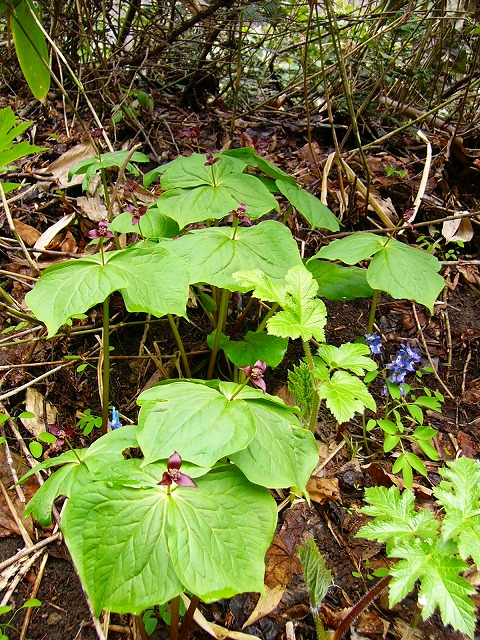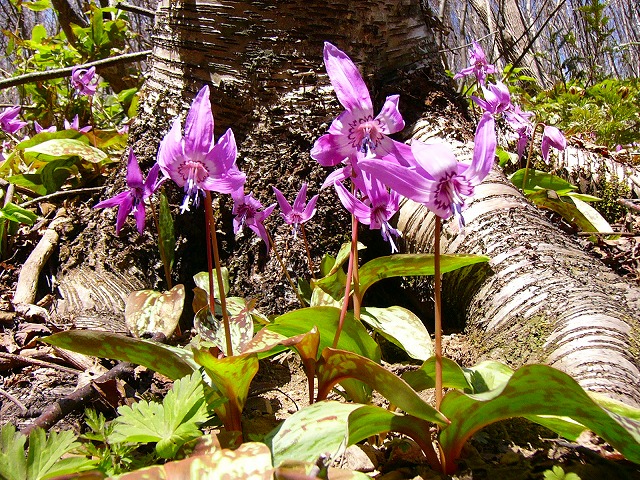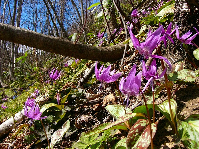 国道とJRの線路が接近している崖地状の場所を見ると,沢水が流れ出ているようなので車を止め,線路を渡って奥に入ってみると,ミズバショウやエゾノリュウキンカが咲いていて,その上部の扇状斜面にはエゾエンゴサクとともにカタクリが咲いている。