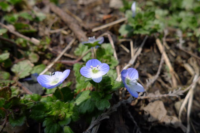 東日原に下りると、スミレが花を咲かせオオイヌノフグリが群れていた。春は確実に近づいている。心配していた燃料不足によるバスの運休もなく、無事奥多摩駅まで行くことができた。駅で新聞や飲み物を調達し電車に乗ろうとしたとき、駅で手にしたパンフレットを落としたが気付かなかった。女性の車掌さんが「落し物ですよ。」と言ってパンフレットを拾って、手で拭ってから手渡してくれた。奥多摩からのJR青梅線は、今日は計画停電の影響で16時30分から22時まで運休との車内アナウンスがあった。