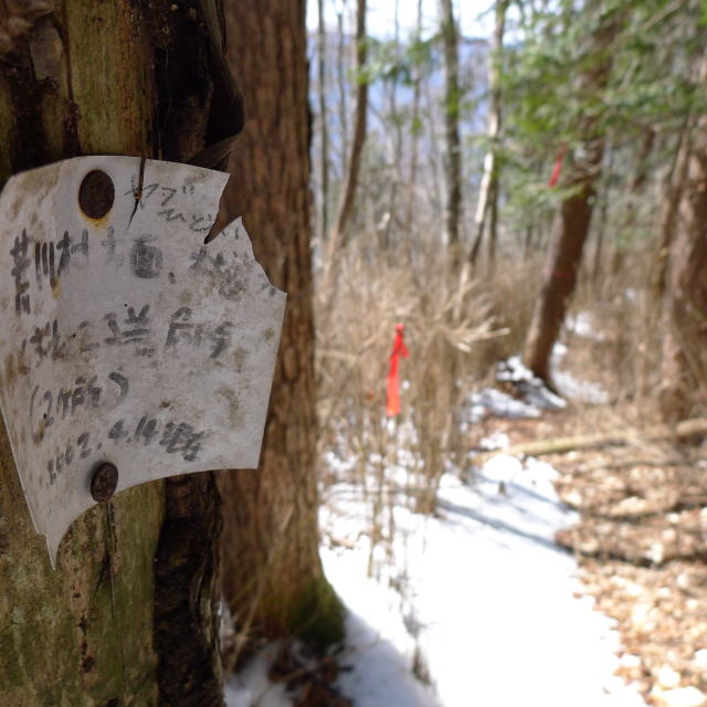 来たりし矢岳からの道に張られている注意書(長沢背稜)