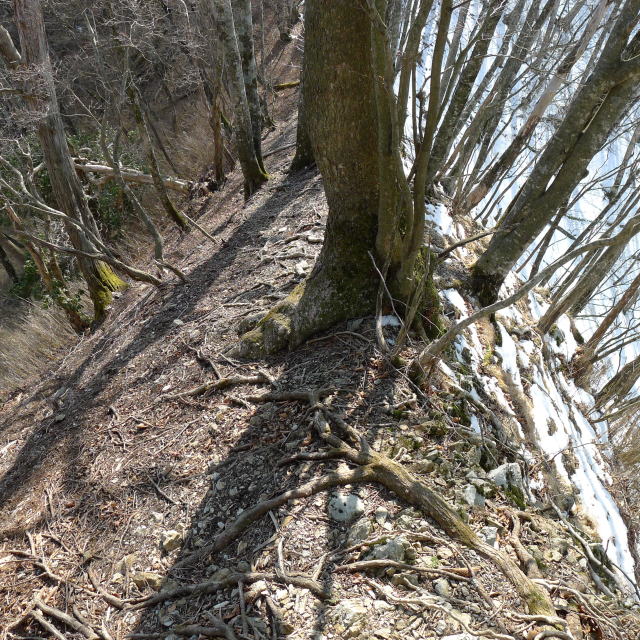 この前は、立橋山(1568m)北面の急傾斜の登りで滑って少し下まで落ちたので、今回は10本歯のアイゼンを用意し赤岩ノ頭(1448m)の手前から装着したのですが、その直前に雪の積もっていない急斜面で落ち葉の下の氷に足を取られて腹ばいになって滑ってしまった際、切り株で二の腕を結構傷つけてしまいました。何よりも口惜しいのはお気に入りだったスマートウールのロングのTシャツを破ってしまったことです。大けがをしなかったことを喜ぶべきであることはよく分かるのですが・・・。ここは標高差70mに30分かかりましたので、アイゼンを付けていても手間暇かかるのぼりであるということがよく分かるというものです。その代り、この周囲には広範囲にわたってアズマシャクナゲが群生していて、その季節には見事な花を咲かせてくれるのでしょうね。過去の記録を見ると5月中旬前後にトウゴクミツバツツジ、アカヤシオツツジやヤマツツジとともに花見ができそうです。また、小黒にもアズマシャクナゲの植生があるようなので、こちらも楽しみですね。