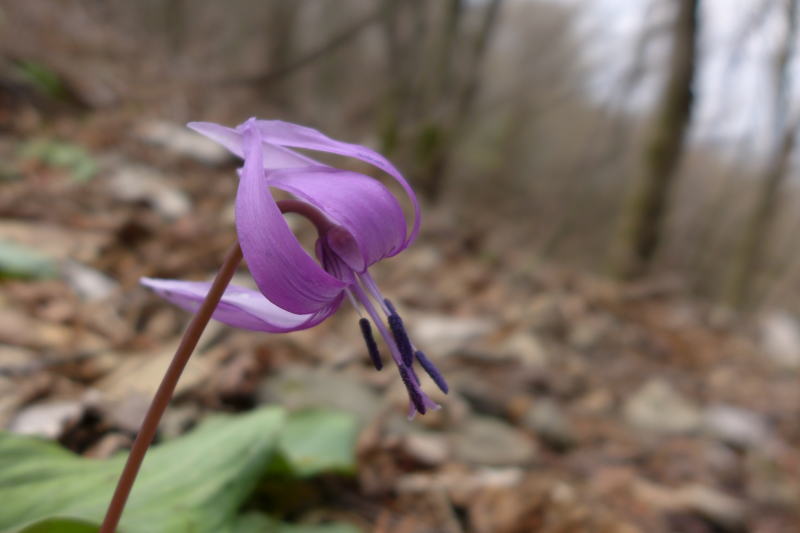 鹿除けネットを開けて鬱蒼とした植林帯から送電線を右に見てクタシノクビレまで歩き、広葉樹2次林の斜面を送電鉄塔の下をくぐってようやく尾根に乗る。篠戸山まではところどころにカタクリが咲く。伐採で展望が開けたところで5分ほど休憩し、カタクリの花を見ながら矢岳へと登る。カタクリは踏み跡となっているところにも幼苗がたくさん生えているが、歩く人が少ないことから踏み潰しを免れている。