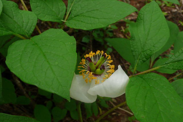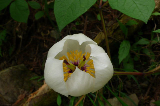 高速を下り、町を抜け、林道に入り、渓流沿いの山の麓に着く。さっそく身支度を整えて山道に入る。山は新緑に包まれている。深呼吸をして木々の香りのする爽やかな空気を肺一杯に吸い込んで歩き始める。今日は徹頭徹尾、ヤマシャクヤクを探すつもりだ。ヤマシャクヤクの花は、北海道に単身赴任中、札幌の郊外を車で走っているときにその防風林だけが他の防風林と様相が違うので入ってみると、林床で初めて一輪の花を見つけて鳥肌が立ち、心が震えた花である。結局、その防風林では開花株だけで16株ほど見つけることができた。