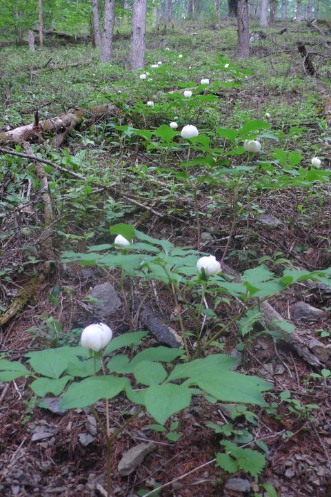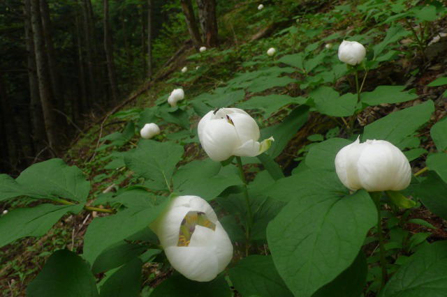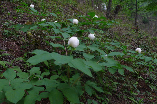 それは純白の花を付け点在する数株のヤマシャクヤクであった。北海道で初めて見た1株のヤマシャクヤクの周辺を探すと10数株あった。四国の山ではやはり沢筋をたどるとおびただしい数のヤマシャクヤクに出会った。ここも、これですべてではないはずと四囲を見渡すと、あるある。たくさんある。驚きと感激で胸が高鳴る。登山靴で株を踏まないよう十分に地面を確認して小苗などがないところに足を置いてシャッターを押す。ここを登ってくる人がいるかもしれない。長居は無用だ。結局、85株を数えてヤマシャクヤクの咲く場所を離れて、目星を付けた場所に向かう。途中、植林帯を振り返って見ると、白い花が遠目に見える。これでは無防備としか言いようがない。