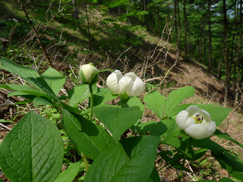 ヤマシャクヤクの咲く場所は、山中でも疎林である必要があるようです。