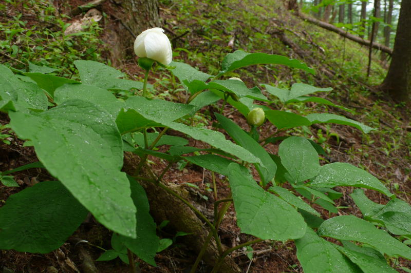傾斜に点在するヤマシャクヤク一つ一つの横を通り過ぎる。