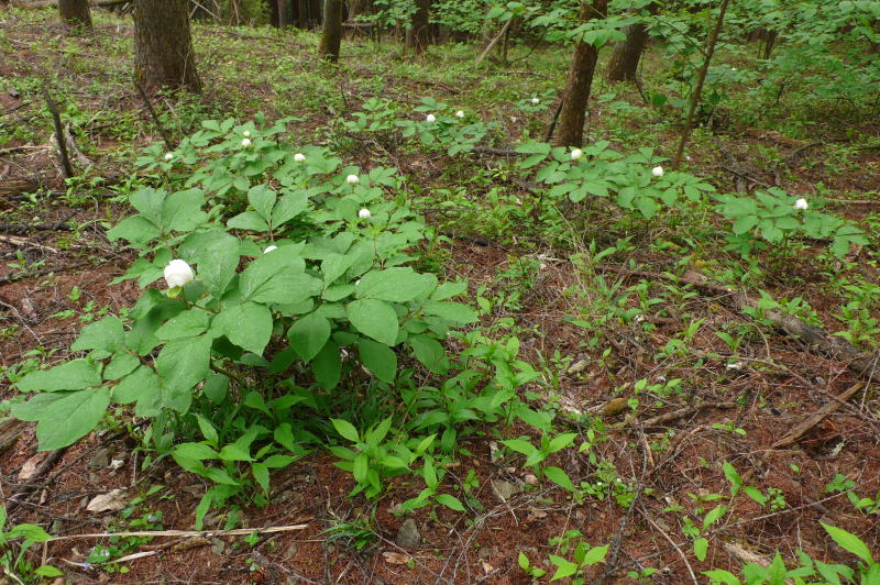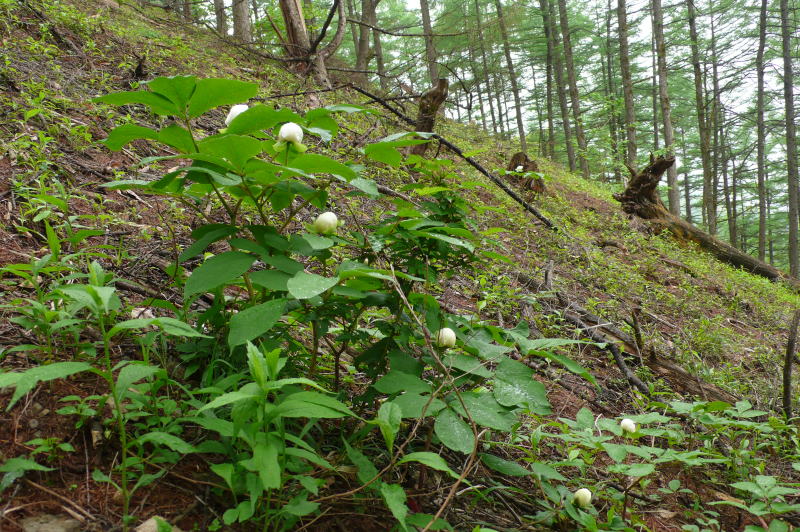 開けたところにヤマシャクヤクがポツン、ポツンと生えていて、