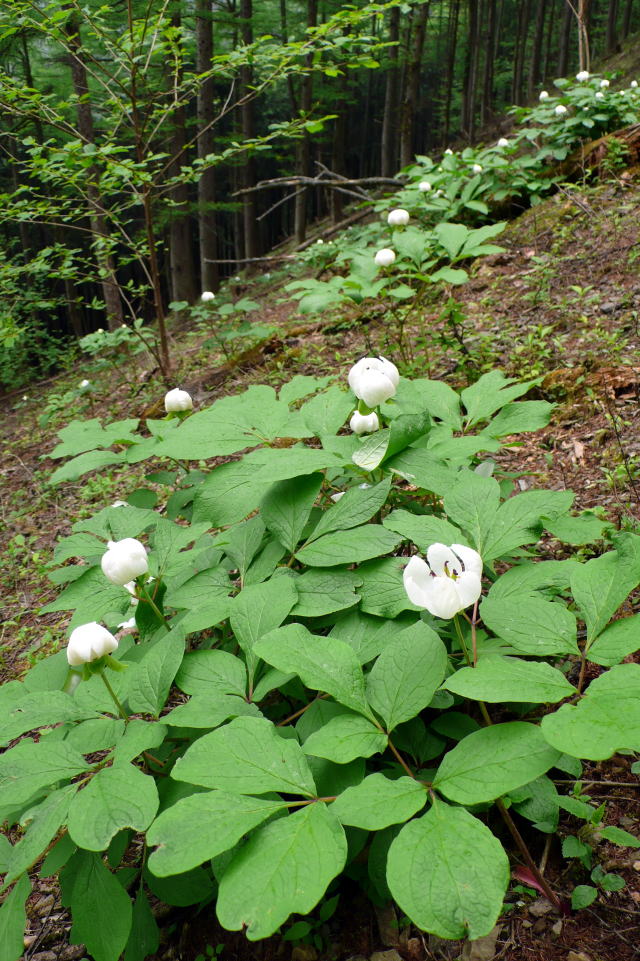 群落地は概して暗いが、それがかえってヤマシャクヤクの白い花弁を引き立たせている。
