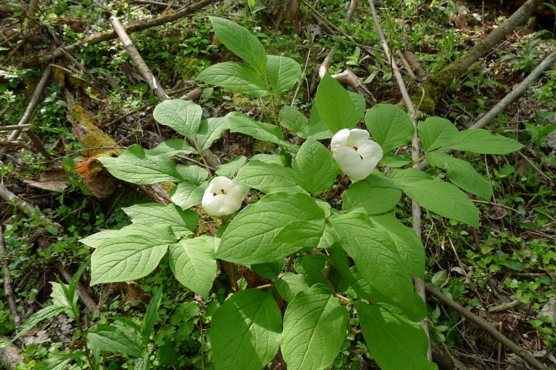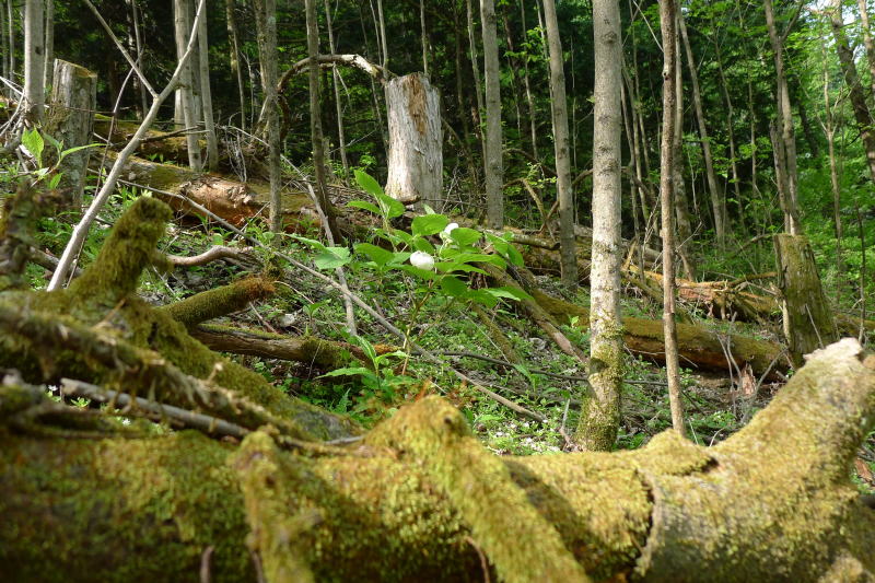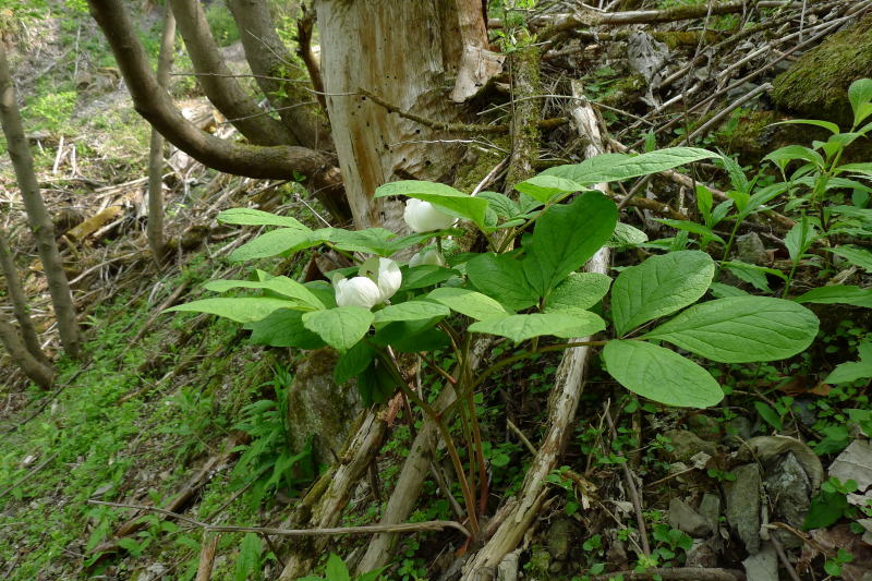 前回、ヤマシャクヤクたちはまだ蕾がほとんどだったことから、もうそろそろだろうと群落地を再訪することにしました。ただそれだけでは芸がないので、あらたな植生の場所を探そうと5ルートほどの見当をつけ、うち1ルートを探索してみました。そのルートではなんの発見もなかったのですが、思いつきで歩いたルートに、なんと20ものかたまりのヤマシャクヤクを見つけることとなったのです。この群落地を「第四群落」としておきましょう。ここは、通常よほどでなければ人が入り込むことのない尾根の10m内外の高低差の鞍部から、わずかに沢状になったところです。最初の一塊のヤマシャクヤクを見つけたときの驚きと嬉しさは、例えようがありません。