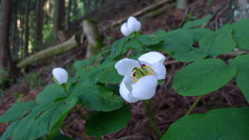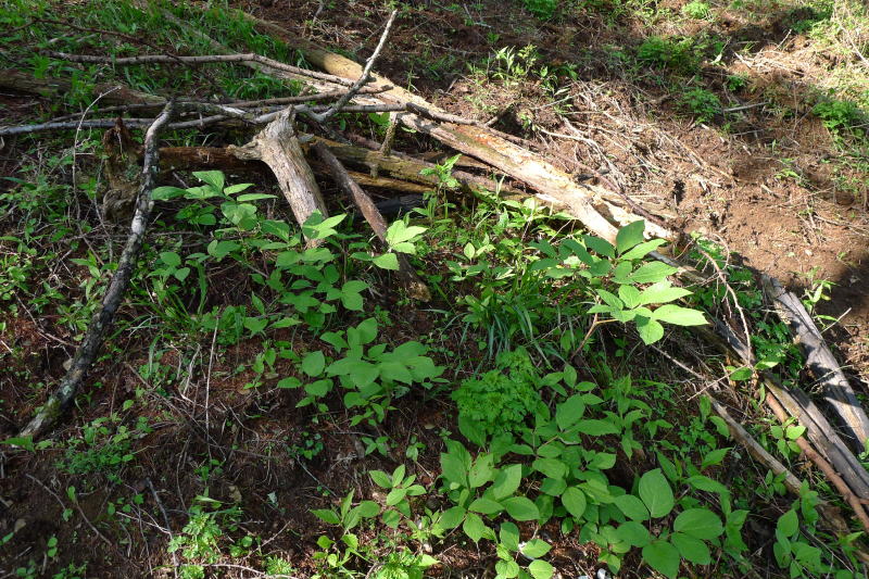 この地のヤマシャクヤクは、これまでの探索の結果では大まかに第一群落〜第四群落の群落群に分かれていたが、今回新たにこれらの群落群から離れた場所に50株ほどのヤマシャクヤクの広がりがあったことから、ここを第五群落とすることとした。(なお、急斜面のガレ場であり、さらなる探索は翌年へ持ち越した。)