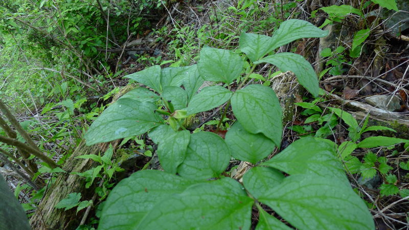 2012年の群落地のヤマシャクヤク開花の盛期が終わった時期を見計らって、この地にあると言われているベニバナヤマシャクヤクの探索に出かけた。1000株をゆうに超える群落地のヤマシャクヤクの中に、もし蕾のままのものがあれば、それがベニバナヤマシャクヤクであるとの可能性を信じて、その1000を超えるすべての株をしらみつぶしに見て歩いた。
