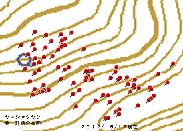 ミツバチが訪れた群落地のヤマシャクヤクの株のかたまり具合を示す。