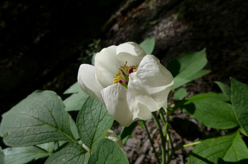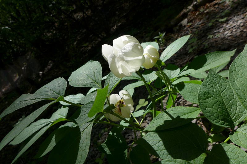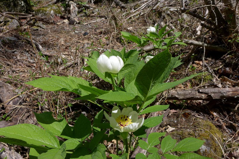 新鮮な空気が漂う山道を早朝から歩く。しばらくすると大株のヤマシャクヤクが葉を広げたくさんの花を咲かせている。しかし、その場所は傾斜がきついので近づくわけにはいかない。そこを離れ先にしばらく進むと、ヤマシャクヤクが群生している。多くのヤマシャクヤクの花期は過ぎているがそれでもわざわざ待ってくれていて「今日咲きました。」というような花も多い。