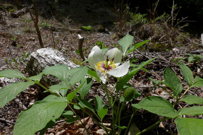 この地のヤマシャクヤクは2014年5月にちょうど全山満開のところを見たのだった。今年(2015年)は春の訪れが早かった。今年は昨年に比べ花たちは10日ほど早く動き出しているようである。そういったことから開花して3日ほどしか持たないヤマシャクヤクは花弁を落としているものも多い。よって、昨年出会った時のような大感動とはちょっと違う。それでも「貴婦人」は美しい。そんな貴婦人に逢うために登って来た山は新緑に覆われて清々しい。