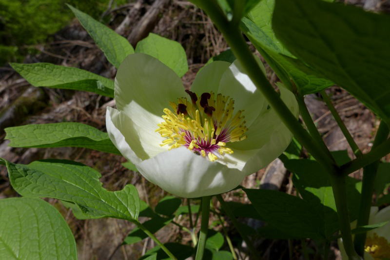 日の射し込みが少ないところにはまだまだ見頃のヤマシャクヤクが多いが、カメラに収めようとすると光が必要だ。さらに標高を上げ森林から出るとぽっかりと広がった空間があり、林縁と広がりの空間にヤマシャクヤクがちょうど見ごろを迎えていた。5月とはいえ朝からの強い日差しを浴びている。