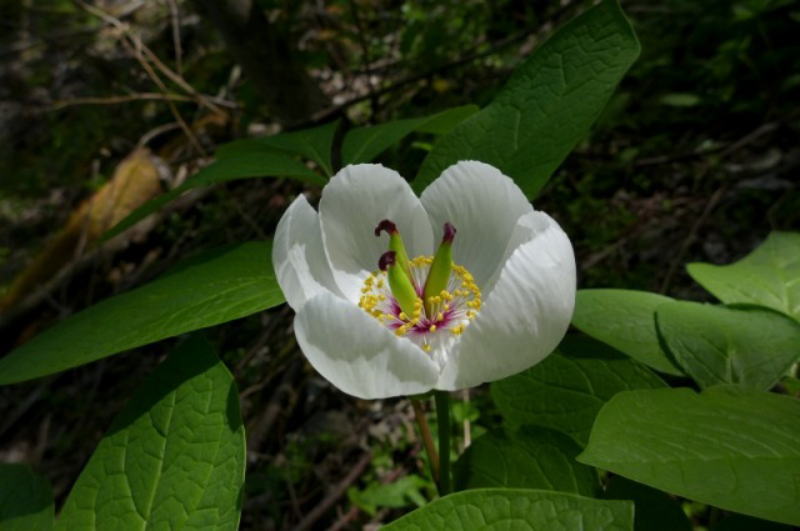 第1の植生地で最初の花に迎えられるものの、その数は10に満たない。第2の植生地に向かう途中に疎らにあるヤマシャクヤクは鞘をしっかり付けていて、今年の花の時期の早さを物語っている。これでは、涸れ沢を登って探索しても面白みはないだろうなと、第2の植生地に入ってみることにする。ここは雑木が適度に生えていて風通しもまあまああるところで陽射しもたっぷり入るので咲き残りはなかったので、深入りせず戻る。