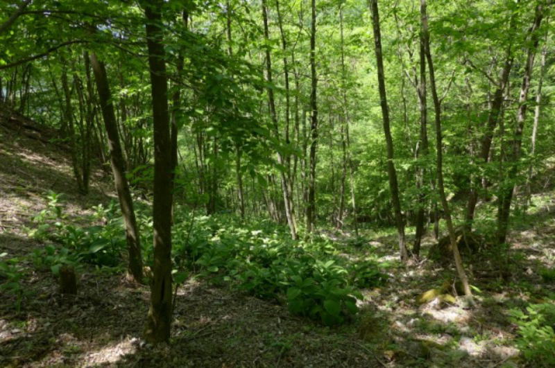 第4の植生地に入る。ここは複雑な地形の先にあるところで、どう考えてもここまでたどり着いてヤマシャクヤクを見るというのは平地に住む一般登山者としてはあり得ないことだろうことなのに、思いっきり入り込んで偶然に見つけた場所である。数は少ないものの、それでも数十株はあるだろう。その中で咲き残りが10株ほどあった。ここは樹相も好ましく、いつも倒木に腰かけて小休止するところである。