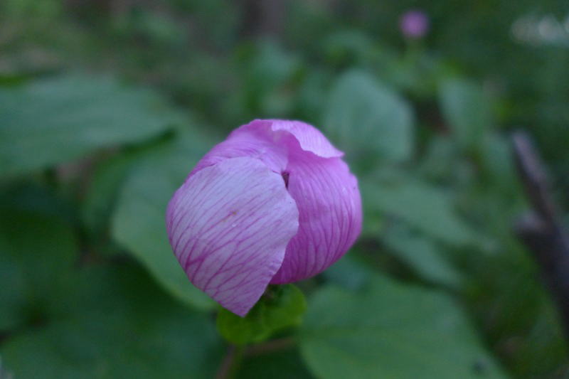 ひんやりした早朝の山に入って行く。あれれ、どこだったっけ、ベニバナヤマシャクヤクがあった場所は?人が容易に足を踏み入れない場所だから一瞬戸惑うが、風景が一致したので行ってみると、驚くことにまだベニバナヤマシャクヤクは花びらを残していた。