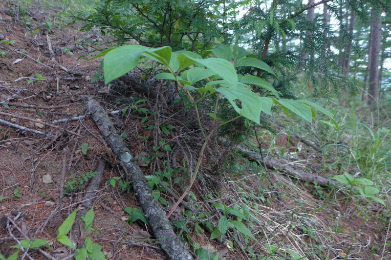 そんな思いで斜面を上り下りして山肌を探索していると、一株のヤマシャクヤクに出逢った。たった一株、ポツーンとあったのだった。ということは、この場所もヤマシャクヤクの植生にとって、そこそこの環境(この地域においては東西に延びた尾根がいいと聞いた)にあるんだな。来年はきちっと探してみよう。