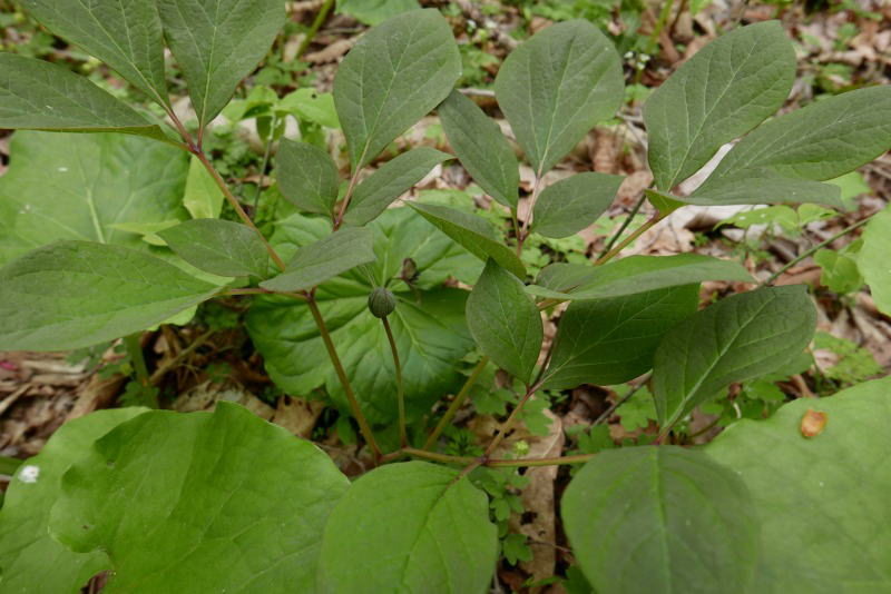 さらに探索を進めると、再び数株を見る。その後ヤマシャクヤクを探し歩くが、一株もない。この場所はこれまでネットに載せられていない。本州から行った者が探し当てられたのだから、地元民が見出すことが不可能なわけはない。今回は、ベニバナヤマシャクヤクの開花時期に2週間以上早かったので、蕾を見ただけで満足としよう。