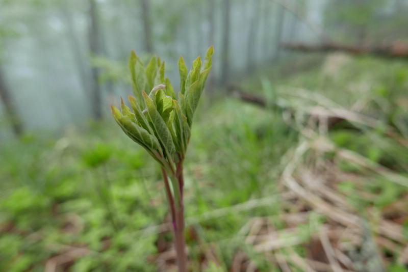 しばらくぶりのいい天気に山に入った。新緑がきれいだ。ベニバナヤマシャクヤクは果たして花開いて待っていてくれるのだろうか。期待半分で秘密の地に足を踏み入れたが、現実はそうたやすく自分の思い通りには運ばない。惜しいことにあと数日後なら花開いているだろうに・・・。