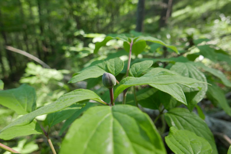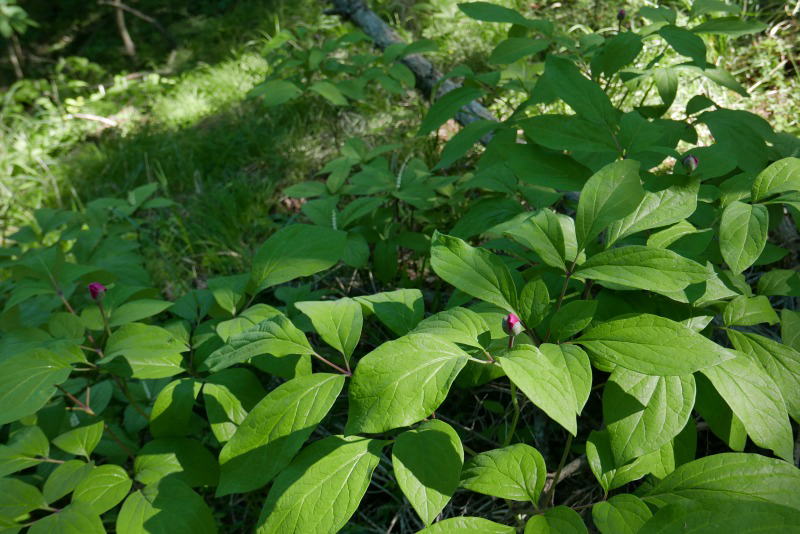 蕾をいただいた開花株が増えている。もう少しで大人となる株もあってこの地のベニバナヤマシャクヤクは確実に生息分布を広げている。自然というのは力強いものだ。人間が見つけて掘り起こしていくまでは・・・。