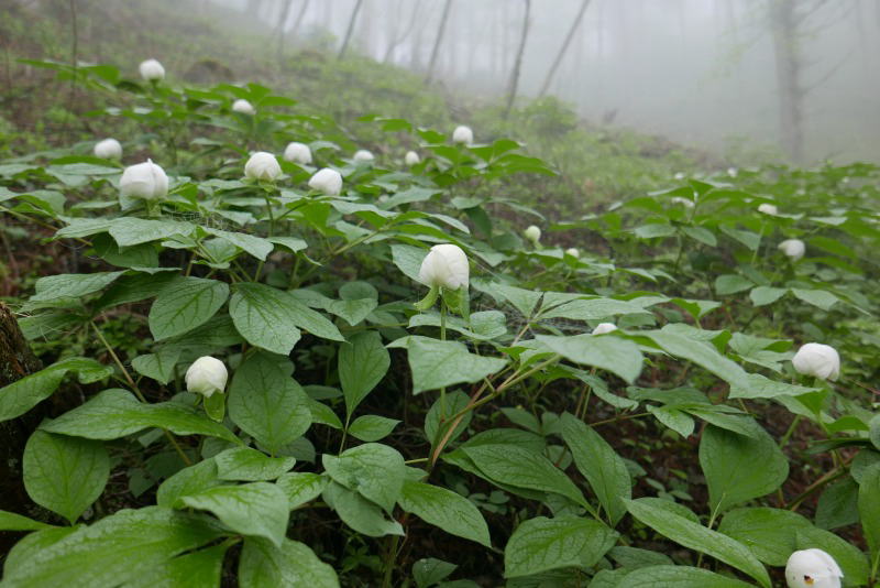 この地のベニバナヤマシャクヤクの今年の株数を確認すると、開花するまでに育ったのは4〜5株で、残りはもう少し時間がかかりそうな株が4株ほどで、幼苗も数株あった。今年の開花時期は6月10日ごろと予想する。ベニバナヤマシャクヤクの地を離れ、白い貴婦人・ヤマシャクヤクが咲く山に向かう。ヤマシャクヤクは例年より開花が遅れ、最初の場所では花弁を開いているものはなかった。ガスに覆われて光が差し込まず気温も低いことも影響していたのかもしれない。