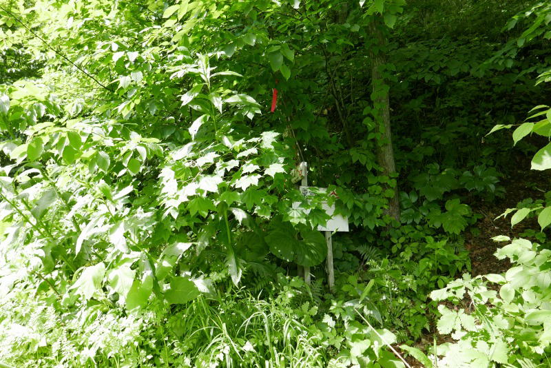 登山道は東側コースも西側コースも、この看板の左手を進む必要がある。道はすっかり背丈の高い草に覆われている。東側コースの取り付き地点を示す赤テープを見つけると草むらの中に道標が佇んでいる。すぐさま斜面となりロープがフィックスされているがそれを頼るほどの急斜面ではない。ジグを切って進むとじきに尾根に上がり、素晴らしい自然林の中のフットパスを歩くようになる。