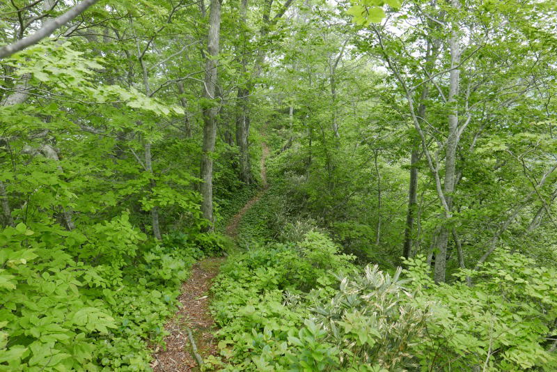前ヤンカからいったん下るが、その間も素晴らしい樹林の中の道が続いている。コルからは樹林の中の登りとなるが、傾斜があってロープが付けられている。登りきるとそこも樹林に囲まれていて、頂上標識がなければただの通過点と言った趣の場所で展望は利かない。
