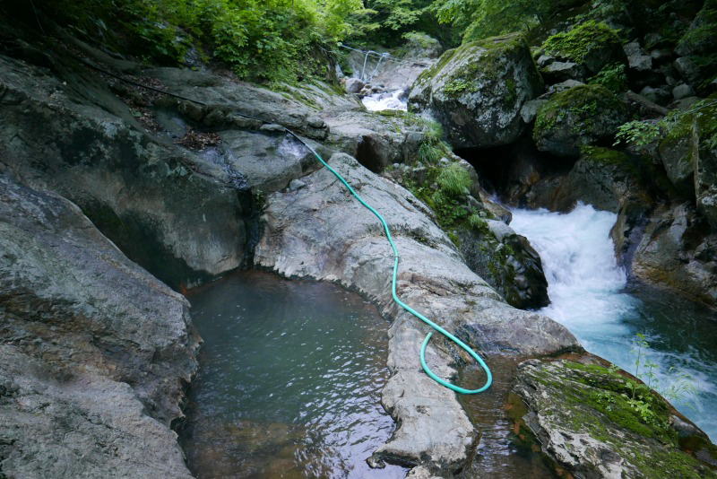 下山後は3日間の汗を流すために熊石青少年休暇村先の「ひらたない荘」に移動したが、大型バスが泊まり乗用車も多かったので、風呂の混雑はごめんだとその先に進んで「熊の湯」という露天風呂に入ることにする。行き止まりの道路の脇に温泉の湧出口がある。露天風呂は道路の反対側の川沿いにあって、誰もおらず源泉掛け流しの贅沢な時間を満喫する。