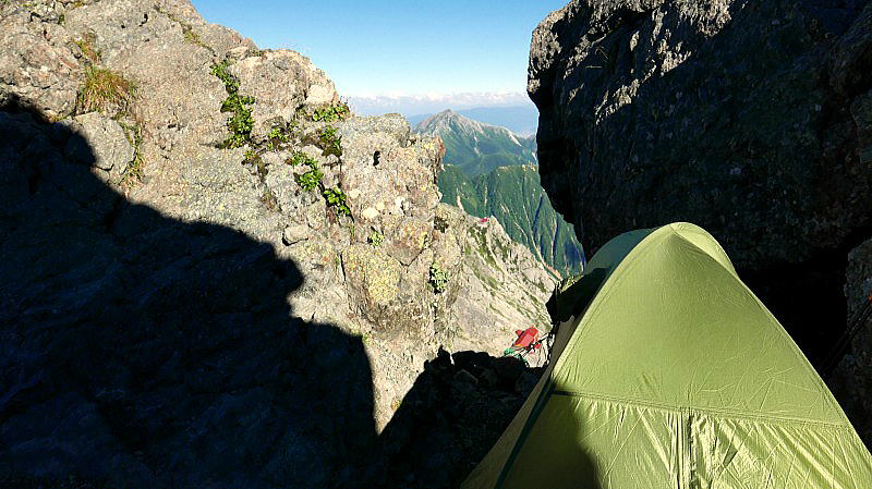 この日のマチュピチュは好きなところを自由に選択できるのだった。槍ヶ岳を真正面に見るところがあることを知らず、飛騨乗越方向斜面に目星をつけていた。槍ヶ岳を真正面に見るテント場が2つ空いていたので、一段高いところに場所を得た。もう一段上には明るく礼儀正しい青年が、明るく鮮やかで発色のいいグリーンのテントを張っている。このテントも一段下の赤のテントも槍ヶ岳の頂上からははっきりとくっきリと認識できる一方、アライのフォレストグリーンはまさしく自然に溶け込んだような目立たないものだということを認識させられたのだった。