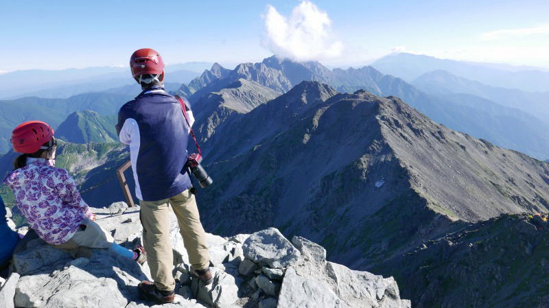 千丈分岐から飛騨乗越まであと半分というあたりで、2人の若い女性が全くおそろいのスタイルで下りてくる。それはそれは渋く機能的な感じの服装+装備であった。声を掛けてルートを聞くと早いうちに新穂高温泉を出発し、槍に登ってきて下りるところだという。明るくてはきはきしていて感じのいいお嬢さん2人であった。そのほか多くの人が日帰りしている。おおむね5時間内外で槍ヶ岳に登っている。そのうちの一人に聞くと「テント場はガラガラですよ。」と言う。ますますペースが落ちてきてしまう。それでも天空のテント場、別名「マチュピチュ」の確保が現実味を帯びてきた。というより、もう一安心ということで足取りも軽くなった。ただ、2016年8月31日午後2時ごろに受付を担当した槍ヶ岳山荘のアルバイト風のおじさんの対応は「×」。冷たい守衛さんのようで、この日唯一のつまらない一瞬だった。そういえばこの小屋のブログのタイトルからして上から目線そのもの。