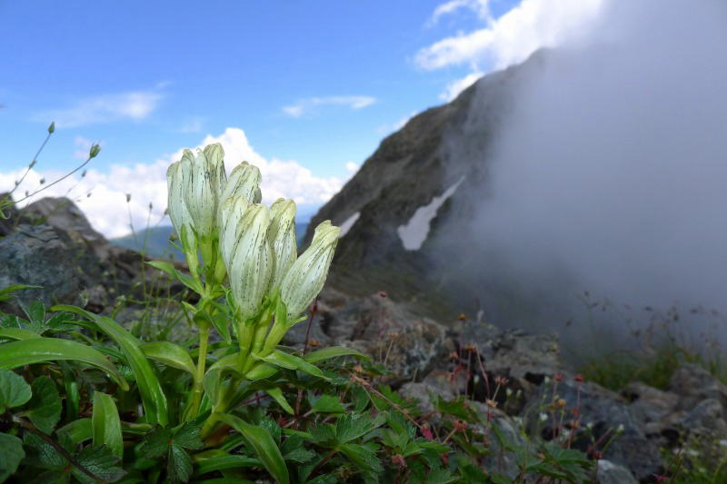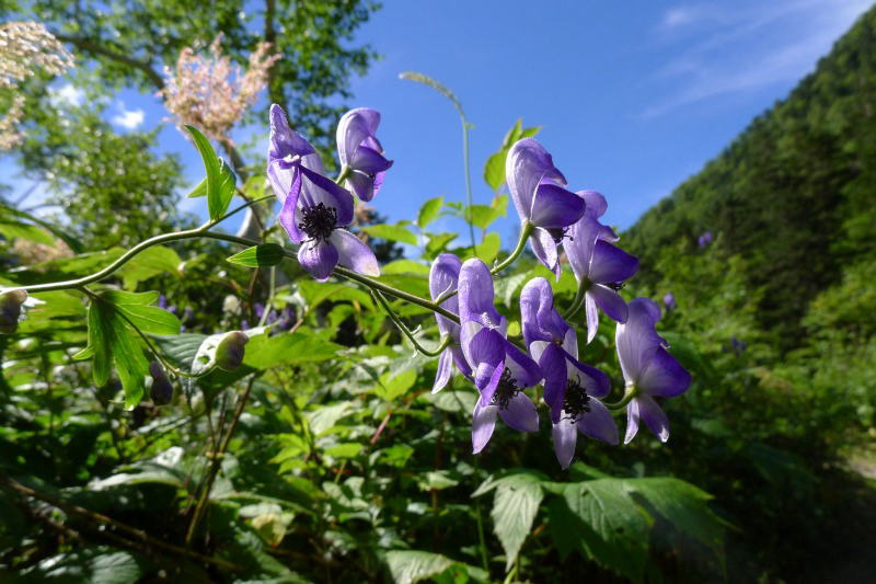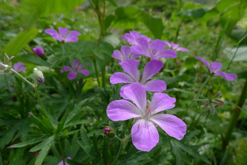 穂高平避難小屋でいったん休憩を入れ白出小屋に向かうが、一緒に歩いていた人が遅れ出したので先に進ませてもらう。荒れた白出沢を渡り滝谷避難尾小屋で一息つける。明るく開けた場所にある槍平小屋で水を補給し飛騨沢沿いの疎林の中を徐々に高度を上げていく。プロトレックの高度計で2280mを指したザレ場に水量豊富な「最終水場」がある。東鎌尾根を左に見やりながら千丈分岐点を過ぎ高度を上げていくとコオニユリ、トリカブト、フウロソウなどが咲くお花畑が広がる。このころ大学生グループが追い着き前後して登る。ただ、お花畑で写真を撮るため、あるいはすれ違う人と山の話、花の話に興じるなどして遅れ、飛騨乗越で追い付いたものの数分間の先行を許し、槍岳山荘でタッチの差で大学生が最後で、テント場が満杯という痛い目に遭った。