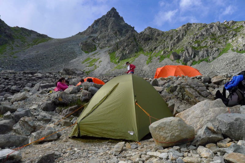 殺生ヒュッテのテント場は、まだ数張りのテントが張られているだけで静かだ。そんな中、2張りのテントの外で、Karaや少女時代(?)の歌を踊りながら歌っている高校生ぐらいの若い女性のグループが賑やかだが、このグループは翌朝は3時ごろから撤収を開始し、整然と下山して行く様子は統制が取られていた。