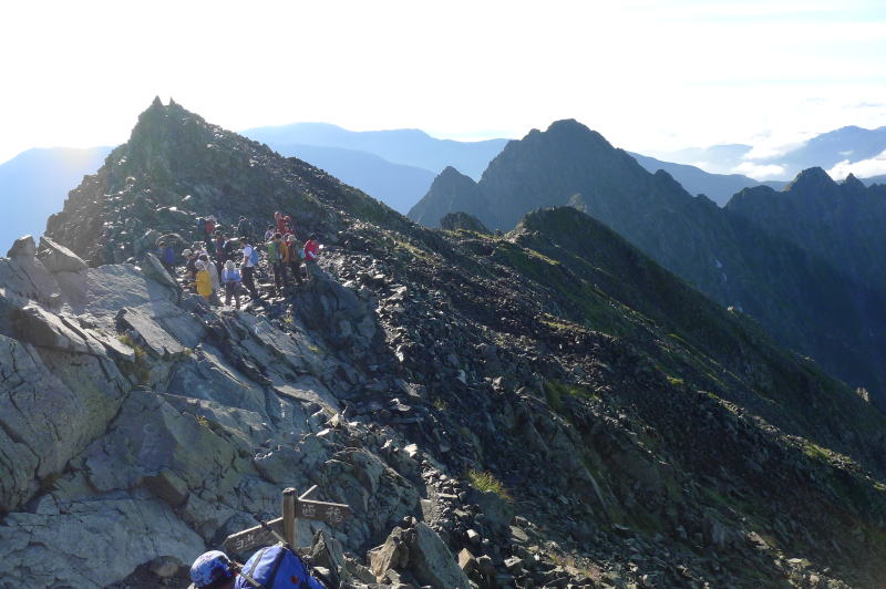 1日目に同道した男性の知り合いが、滑落した人の巻き添えになって死亡したというので、これから先は渋滞に合わないようにしたり、落石や滑落があったときに退避できるよう調整しながら歩くことを考える。そのため、奥穂高の登り始めは渋滞がやや解消した午前6時近くとなる。