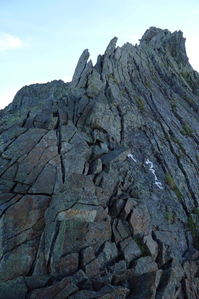 先行く4人が完全に鞍部から離れたことを確認し、馬の背から急降下する。石ころ一つ落としても重大事に至る。ここに鎖やボルトの類は一切ない。