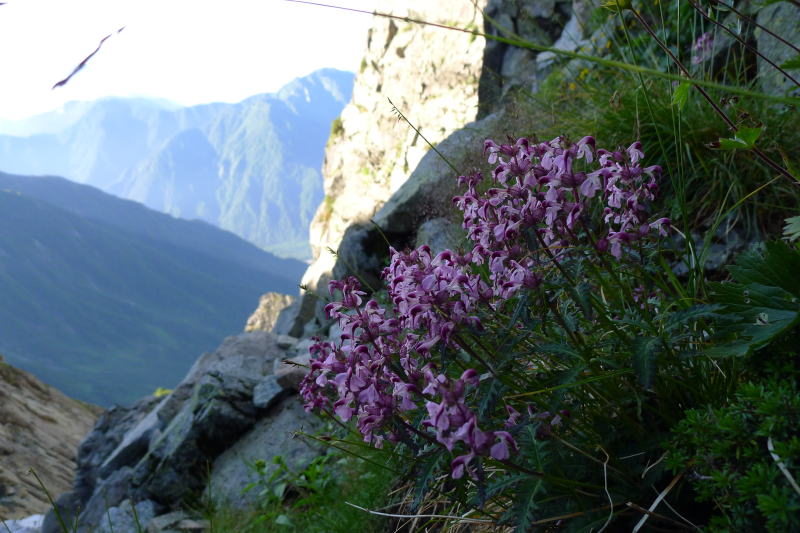 4人はロバの耳に取り付いている。その間一休みする。するとコルの崖の先にヨツバシオガマが群生している。さあ、この先からも厳しい登りが待っている。ここは、2009年に田部井順子さんとNHKの内多勝康アナウンサーが番組の収録で登った際、田部井さんの足がスタンスが広すぎて上がらなかったところだ。先に登った4人パーティの女性も同じように足場に困っている。(この方たちの好山病日記)