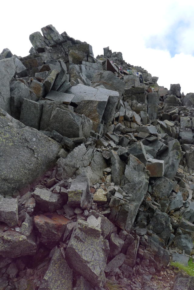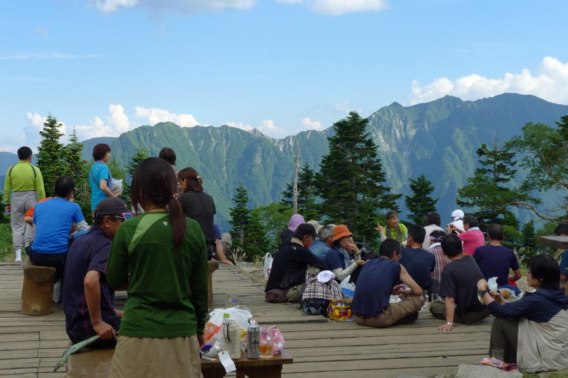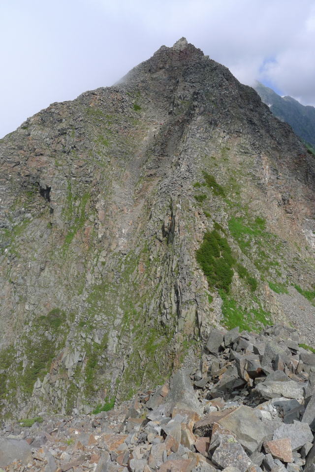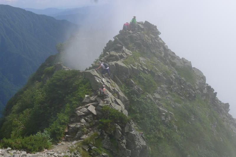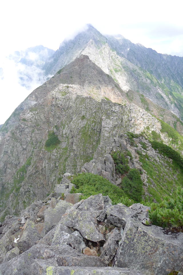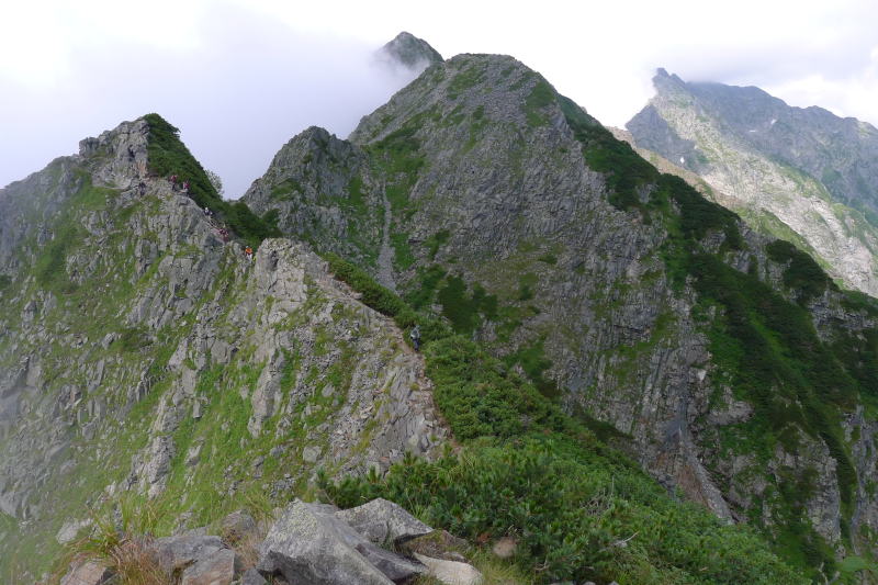 ようやく西穂高岳に登るとそこは賑やかな日常の山の世界。止まることもなく、振り向くこともなく頂上を過ぎ去る。先にピラミッド峰。下りのスラブで上下双方が錯綜し渋滞している。若者数人がぺちゃくちゃおしゃべりをしながら手掛かりを探しているようで何もしてないような、もたもたしているように見える。「黙ってまじめにやれよ。迷惑だろう。落ちたらどうするんだ。」と一喝しつつ、退避する場所、その後のルートを示す。