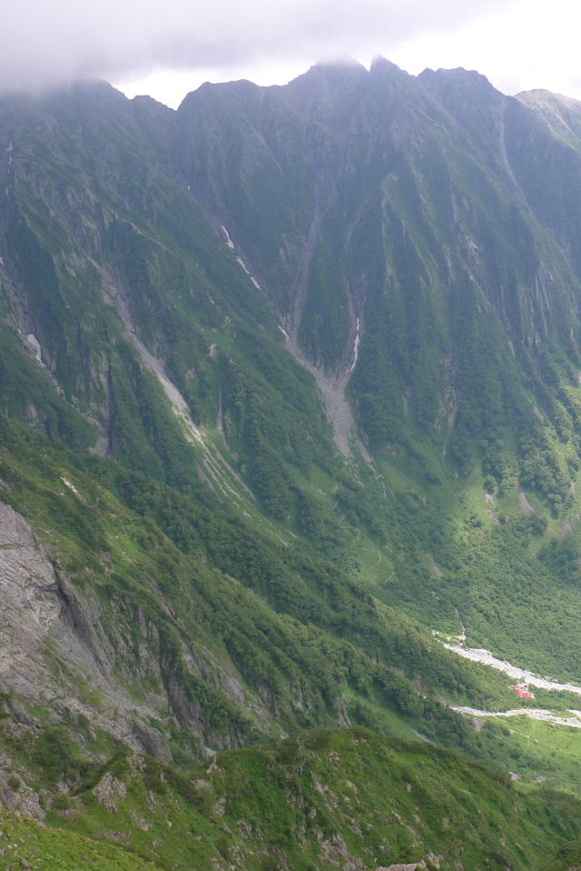 岳沢小屋から重太郎新道が左手上部に伸びる