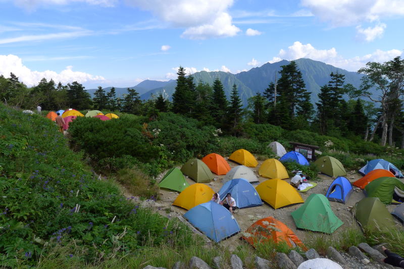 西穂山荘のテント場 (午前中で満杯になるとか)