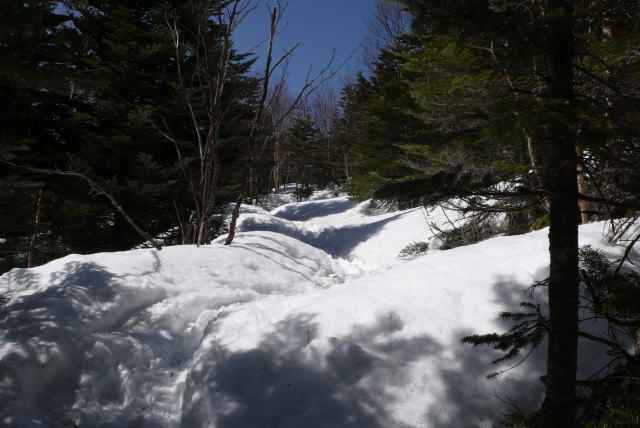 杖立峠からいったん下って苺平を目指すと徐々に傾斜が増すとともに、積雪も多くなる。風は強いが日差しがあり気温が高くなる。前者の足跡をはずすとズボッと股下まで潜る。木々が「ギーギー」「ゴーゴー」「ボギボギッ」と音を立てて揺れている。北岳、間ノ岳、農鳥岳を越えてくる強風がゴーゴーとシラビソの木々の上を通り過ぎていく。