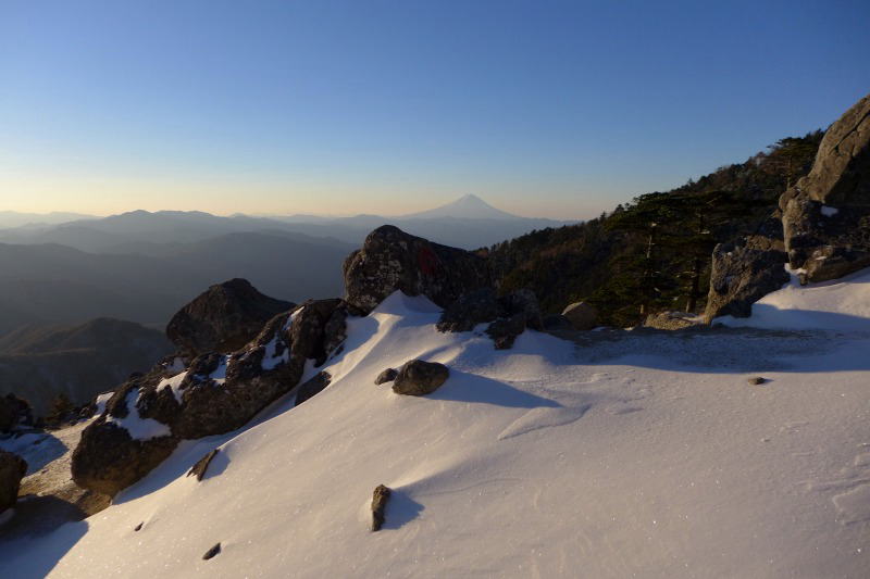 南御室小屋に着くと、テントを張っている男女がいます。時刻はまだ午前10時前なので、夜明け前から登ってきたのでしょう。テントに入って山専ボトルに詰めた温かいものを飲みホッとします。さて、テントの撤収ですが、この時間でも気温はマイナス15℃です。テントの中でできるものはすべてパッキングし最後にテント本体をたたみますが、あちこちが凍っていて嵩張るのでそのままテントに放りこみます。テントはエアーマットの間に水分が溜まっていました。エアーマットのR値(マットの暖かさを示す「熱抵抗値」)が夏山用の2.3なので、マットから熱が相当逃げて行ったからのことだったのでしょう。